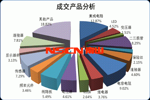 根據(jù)數(shù)據(jù)中心熱門搜索產(chǎn)品數(shù)據(jù)以及成交產(chǎn)品對比分析計算得出,排名靠前的幾類成交產(chǎn)品分別為集成電路、二三極管、電容電阻、連接器等。當(dāng)然綜觀全年的的成 交數(shù)據(jù)來看,各類產(chǎn)品的成交量、成交金額均屬行業(yè)熱門產(chǎn)品。這一切都要歸功于殺手級產(chǎn)品,如照明燈具、汽車電子、消費類電子等終端電子產(chǎn)品的推動,促使行 業(yè)正向積極的增長。