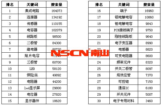 買家搜索關(guān)鍵詞排名及次數(shù)如下: (1) 集成電路164073 (2)連接器 134192 (3) 傳感器110155 (4)電容器102079 (5) 線路板98500 (6) 二極管84300 (7) 繼電器80720 (8) 貼片電容71147等。