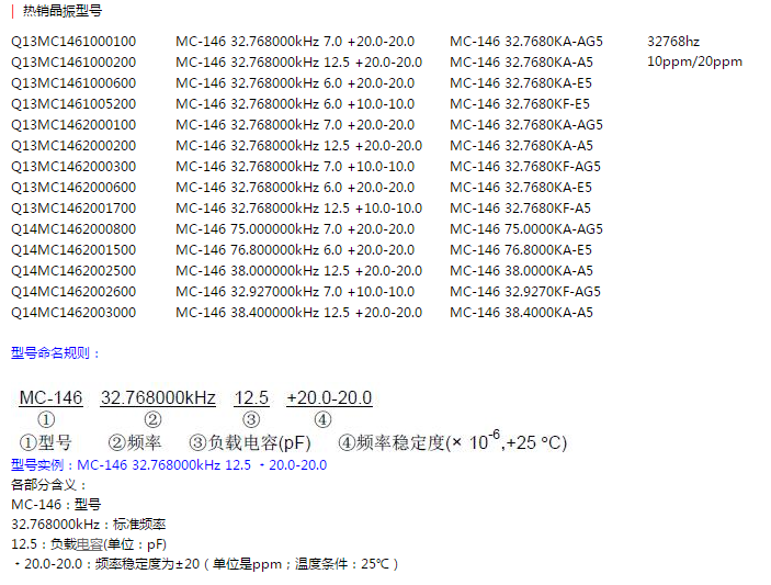 MC-146晶振,愛普生晶振,32.768KHZ千赫子時鐘晶體,其本身主要應(yīng)用在時鐘控制產(chǎn)品,或者是控制模塊,主要給時鐘芯片提供一個基準(zhǔn)信號,MC-146具有優(yōu)良的耐熱性,耐環(huán)境特性,可發(fā)揮晶振優(yōu)良的電氣特性,MC-146規(guī)格上具有較小的尺寸和串聯(lián)電阻,基于EPSON高端QMEMS技術(shù),使晶振性能穩(wěn)定可靠,適用于各類對品質(zhì)要求較高的小型電子設(shè)備中如消費(fèi)類設(shè)備,無線電設(shè)備,血壓計,血糖監(jiān)測儀和安全系統(tǒng)應(yīng)用中的應(yīng)用處理器,南山半導(dǎo)體為您精心整理出MC-146規(guī)格,參數(shù)。熱銷型號如下圖所示:
