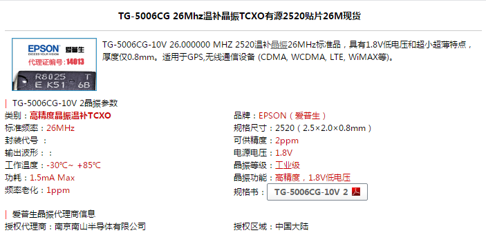當(dāng)然除了上述TG-5006CG-10V 26.000000 MHZ X1G0042110001之外 ,作為愛普生晶振在中國大陸地區(qū)授權(quán)的核心代理商,南京南山半導(dǎo)體有限公司提供愛普生全系列溫補(bǔ)晶振產(chǎn)品,點(diǎn)網(wǎng)站右上方在線購買,或者去我們南山電子的某寶店——南山E店選型訂貨。
