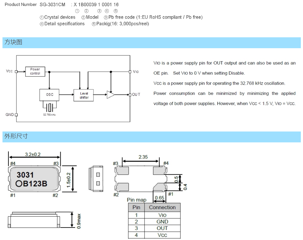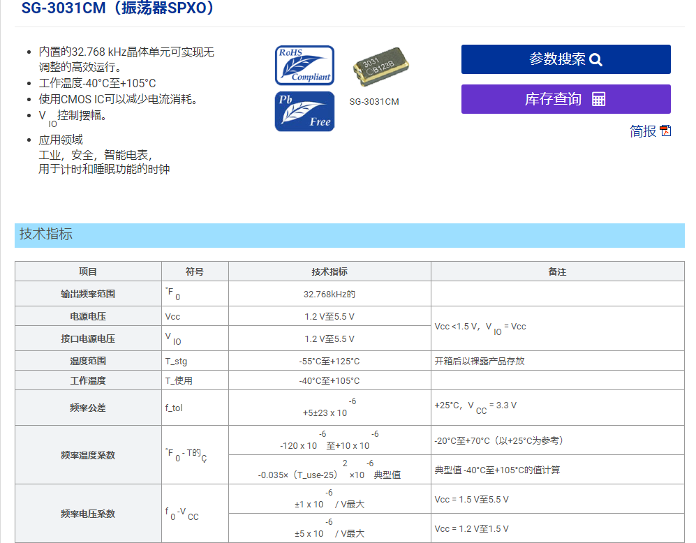今天給大家介紹愛普生新推出的一款低壓且有固定頻率的晶振SG-3031CM。SG-3031CM是一款32.768K有源晶振,大家都知道32.768kHz一般無源晶振較多,而SG-3031CM類似于SG-3030CM,同屬于32.768K有源晶振,工作溫度寬至-40°C至+105°C。SG-3031CM兼容CMOS芯片技術,具有優(yōu)化的CMOS IC設計,最大0.65uA的低功耗,可以有效減少電流消耗。內置的32.768 kHz晶體單元可實現(xiàn)無調整的高效運行。電源電壓范圍從1.2V至5.5V,這也是SG-3031CM一個特點,相比于3030CM,SG-3031CM可以在更低的電壓下運行,SG-3031CM晶體振蕩器,采用標準3215小尺寸封裝,四個焊接腳位,SG-3031CM可以應用于工業(yè),安全,智能電表,用于計時和睡眠功能的時鐘。下面南山電子就給大家分享最新SG-3031CM中文規(guī)格書,以便大家選型參考: