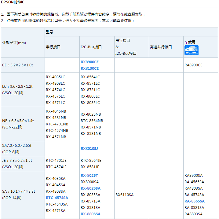 今天給大家匯總一些時(shí)鐘芯片不常用料,如RTC-4543SA等,雖然這些料和時(shí)鐘芯片RX-8025T,RX8010SJ等常用料不能相比,但是有時(shí)候急需卻沒有貨,屬實(shí)會讓人著急,舉個(gè)例子,近期疫情之后復(fù)工,南山電子就已經(jīng)賣出去不少比較不常用的時(shí)鐘芯片。如:RTC-4543SA,RTC-72423,RX-4581NB,RX-8026T,RX-8581SA,RX-4571SA,RA-8565SA,RX-8571LC,RX-8581SA,RX-4803SA,RX-4571SA,RX-4045NB,RX-4803LC,RX-8803LC,RX-4045SA,RA-8565SA,RTC-4543SA,RX-4803SA,RX-8564LC等等。實(shí)時(shí)時(shí)鐘模塊也被簡稱為時(shí)鐘芯片、時(shí)鐘模塊。英文簡寫為RTC,因此也有國內(nèi)工程師稱其為RTC時(shí)鐘。是將32.768kHz石英晶體振蕩器和實(shí)時(shí)時(shí)鐘芯片合為一體的產(chǎn)品,具備振蕩電路、時(shí)鐘功能、日歷功能和報(bào)警功能等。集成了晶體單元就意味著EPSON實(shí)時(shí)時(shí)鐘模塊不需要頻率調(diào)整。愛普生實(shí)時(shí)時(shí)鐘模塊的產(chǎn)品線實(shí)現(xiàn)了精確計(jì)時(shí)和低功耗,對于在單機(jī)模式設(shè)備上的應(yīng)用非常理想。相信很多人要問了除了RTC-4543SA等這些近期出售的不常用料,是否可以做個(gè)愛普生時(shí)鐘芯片總表,南山電子滿足您的要求,給大家整理出全部時(shí)鐘芯片的相關(guān)型號以供大家選型參考: