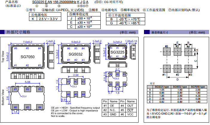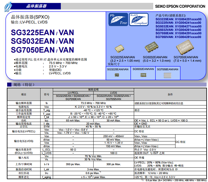 今天給大家介紹愛(ài)普生差分晶振中的SG3225VAN。我們都知道差分晶振中熱門的型號(hào)是SG7050VAN,但是隨著工業(yè)化的發(fā)展,小型化是未來(lái)的趨勢(shì),SG3225VAN就是愛(ài)普生為時(shí)鐘設(shè)計(jì)新推出的SPXO晶振系列,適合10GbE、40GbE、100GbE超寬頻以太網(wǎng)絡(luò),可廣泛用于醫(yī)療、測(cè)試測(cè)量、消費(fèi)電子、工業(yè)自動(dòng)化等領(lǐng)域。SG3225VAN具有低功耗水平,并且通過(guò)OE引腳可實(shí)現(xiàn)輸出使能。在正常工作狀態(tài)下,電流損耗低至30mA,而*大啟動(dòng)時(shí)間僅為3ms,保證了低功耗設(shè)計(jì)對(duì)設(shè)備喚醒速度的要求。當(dāng)輸出端口OE接地時(shí),關(guān)閉電流*大20mA,使其更容易實(shí)現(xiàn)低功耗設(shè)計(jì)。SG3225VAN的工作溫度為-40℃~85℃,符合工業(yè)級(jí)產(chǎn)品標(biāo)準(zhǔn)。外觀尺寸為3.2×2.5×1.05mm,小型化封裝有利于提高系統(tǒng)設(shè)計(jì)的靈活性。SG3225VAN的電源電壓為2.5V~3.3V,輸出頻率73.5MHz~700MHz,結(jié)合低抖動(dòng)PLL技術(shù)和內(nèi)置AT晶體單元,可產(chǎn)生穩(wěn)定的輸出信號(hào);頻率偏移誤差*低±20ppm,*大相位抖動(dòng)不超過(guò)0.6ps,SG3225VAN非常適合對(duì)時(shí)鐘信號(hào)完整性有嚴(yán)格要求的系統(tǒng)??紤]元件老化的影響,其頻率老化率僅為±5ppm/年,大大提高了元件的使用壽命。SG3225VAN分別支持LV-PECL和LVDS標(biāo)準(zhǔn)差分信號(hào),增強(qiáng)了輸出信號(hào)的抗干擾能力,可作為標(biāo)準(zhǔn)模塊在電路中直接應(yīng)用。近年來(lái),對(duì)小型化、多功能網(wǎng)絡(luò)設(shè)備的需求不斷增加,SG3225VAN以其低功耗、小型化、高穩(wěn)定性等優(yōu)點(diǎn),在手持設(shè)備、穿戴式設(shè)備以及物聯(lián)網(wǎng)等網(wǎng)絡(luò)設(shè)備中具有廣闊的市場(chǎng)前景,可有效延長(zhǎng)設(shè)備使用壽命、縮短產(chǎn)品開(kāi)發(fā)周期。目前市場(chǎng)主流差分晶振都是6腳貼片封裝,頻率比普通晶振相比較高,可以從50MHz到700MHz.常用的頻率有:SG3225VAN,74.25MHz,100MHz,125MHz,148.5MHz,150MHz,200MHz等,下面南山電子就給大家提供SG3225VAN的規(guī)格書,供大家選型參考: