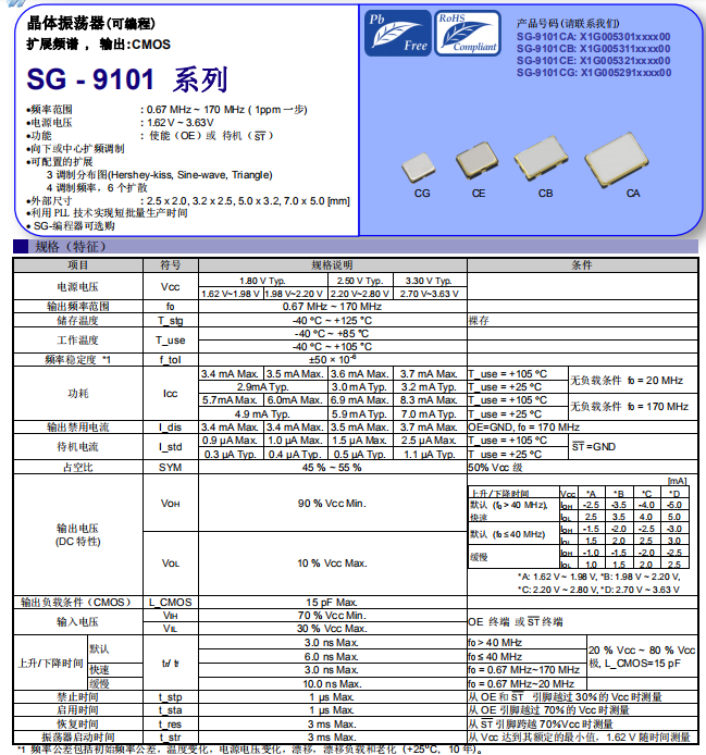大家好,今天給大家介紹展頻晶振中的SG-9101CG。SG-9101型號可以分為: SG-9101CA,SG-9101CB ,SG-9101CE ,SG-9101CG。SG-9101CG是其中小尺寸的2520晶振隨著市場小型化、多功能、高信賴度的電子產(chǎn)品需求量大增,產(chǎn)品開發(fā)周期時(shí)間要求越來越短,傳統(tǒng)的石英晶振性能優(yōu)異,但設(shè)計(jì)制造周期相對較長,如果有工程師因?yàn)轫?xiàng)目急需特殊頻點(diǎn),特殊封裝的晶振產(chǎn)品用于設(shè)計(jì)測試,很有可能無法短期內(nèi)獲得對應(yīng)頻點(diǎn)的樣品而可能耽誤設(shè)計(jì)周期,影響項(xiàng)目交付進(jìn)度。展頻晶振的出現(xiàn)很大的解決了工程師對新產(chǎn)品晶振的實(shí)時(shí)變更需求。SG-9101CG內(nèi)置一個(gè)高穩(wěn)定的有源晶振(基頻),利用PLL技術(shù),配合對應(yīng)的工具軟件及外置的編程器方便的調(diào)整分頻/倍頻參數(shù),并在線燒錄,幾分鐘就定制成一個(gè)客戶所需的全新晶振。這樣就大大節(jié)省了客戶的等待時(shí)間,實(shí)時(shí)提供樣片供用戶測試。另外對于用量相對較小的用戶,可以采取這種方式批量生產(chǎn),極速交付。SG-9101系列可以分為: SG-9101CA 7050  SG-9101CB 5032 SG-9101CE 3225 SG-9101CG 2520 ,也就是說SG-9101CG是小尺寸2520有源晶振同時(shí)也是銷量很高很受歡迎的一款展頻晶振。SG-9101CG頻率可編程范圍0.67MHz~170MHz(每步1ppm),擴(kuò)展頻率范圍±0.25%~±4%。SG-9101CG新品提供更寬廣的操作溫度范圍,及降低50%的消耗電流。SG-9101CG擴(kuò)展頻率晶振的消耗電流比現(xiàn)行量產(chǎn)品更大幅降低了75%。SG-9101CG的展頻晶振提供幾種類型的調(diào)制方式,可以實(shí)現(xiàn)б值為±0.5%、±0.75%、±1%、±1.5%、±2%和0.25%的調(diào)制,實(shí)踐證明引入展頻晶振調(diào)制引入的時(shí)鐘信號抖動很小。SG-9101CG通過動態(tài)改變時(shí)鐘頻率,有效降低d電磁輻射功率,減少EMI電磁干擾的影響,南山電子依然給大家提供SG-9101CG規(guī)格書以供大家選型參考: