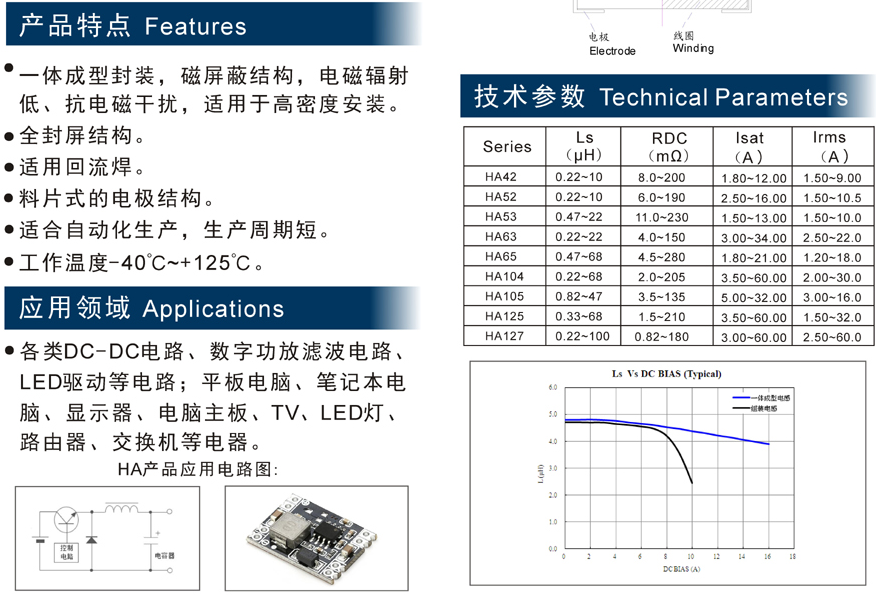 風(fēng)華HA系列一體成型功率電感產(chǎn)品特點(diǎn)技術(shù)參數(shù)等如下圖所示: