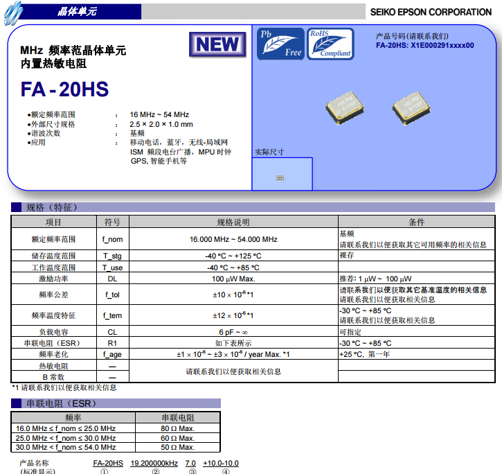 說到熱敏晶振很多人一定比較陌生,顧名思義,熱敏晶振就是內(nèi)置熱敏電阻的晶振,也可以稱為熱敏電阻晶振。今天就給大家介紹愛普生熱敏晶振的常用型號FA-20HS的特征和選型。首先我們來說說熱敏晶振的特征,有溫度傳感器的熱敏晶振在工作過程中受到了溫度感應(yīng)時(shí)可以使晶體產(chǎn)品在工作過程中保持一個(gè)精準(zhǔn)的不變的溫度,使晶振產(chǎn)品的精度給CPU提供信號的同時(shí)又能避免因?yàn)闇囟鹊膯栴}給晶振造成頻率較大的偏差。其實(shí)說白了,熱敏晶振就是為了可以代替昂貴的溫補(bǔ)晶振成本而制造的,雖然熱敏晶振并不能代替的溫補(bǔ)晶振,但是適合使用在一些常用電子產(chǎn)品如的智能手機(jī),空調(diào)等。熱敏晶振采用的原理就是在普通貼片晶振的基礎(chǔ)上增加了一顆熱敏電阻,以及一顆變?nèi)?a href='http://m.ys074.cn/tiepianerjiguan.html' target='_blank'>二極管,利用了變?nèi)荻O管的容變功能在結(jié)合熱敏的傳感功能相結(jié)合,就變成了今天這個(gè)帶有溫度傳感功能的熱敏石英晶振,如愛普生推出的小尺寸內(nèi)置熱敏電阻的晶振FA-20HS。熱門頻點(diǎn)為FA-20HS  26MHz 7.8pF 10ppm 料號為X1E0002910026。下面南山電子就給大家分享下熱敏晶振FA-20HS規(guī)格書以供大家選型參考: