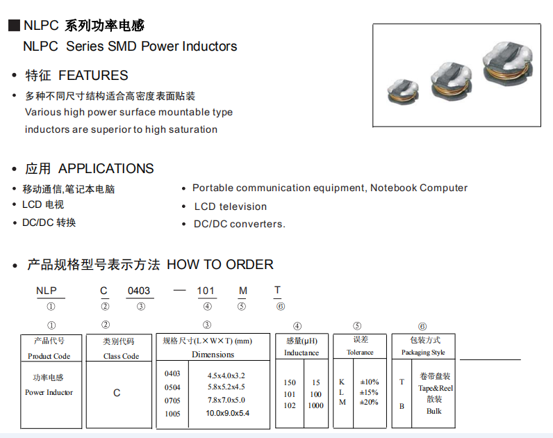 今天來介紹下功率電感,那么功率電感與普通電感到底有哪些區(qū)別呢?首先,其實(shí)任何電感通電時(shí)都有一定的功率,此功率一般是是無功功率,如果電感中通過的電流要比導(dǎo)線的飽和電流小很多,一般不稱之為“功率電感”。所謂功率電感,一般指那些電流較大的電感,除了電感量之外,還要考慮通過電流大小。當(dāng)然如果電感的電流較大,而電壓也很高,就是功率電感了。那么貼片功率電感功率電感又有哪些區(qū)別呢?功率電感其實(shí)是一個(gè)籠統(tǒng)的說法,功率電感一般分為貼片功率電感和直插功率電感。貼片功率電感也可以稱為繞線電感,而直插功率電感一般具有燕高效率及高飽和電流。一般應(yīng)用在打印機(jī),液晶電視,復(fù)印機(jī)上。南山電子主要與風(fēng)華高科合作,代理風(fēng)華的功率電感,一般有以下幾個(gè)系列:MS功率電感,PIO功率電感,PRS功率電感,HA功率電感等,除了風(fēng)華高科品牌,NLP功率電感是南山電子自主品牌產(chǎn)品線之一。目前NLP功率電感主要推出NLPC系列、NLPF系列、NLPE系列、NLPM系列、NLPP系列、NLPH系列等主要六個(gè)系列功率電感產(chǎn)品。型號規(guī)格可以替代風(fēng)華高科相關(guān)系列功率電感,在這里選擇其中一個(gè)NLPC系列功率電感規(guī)格書如下: