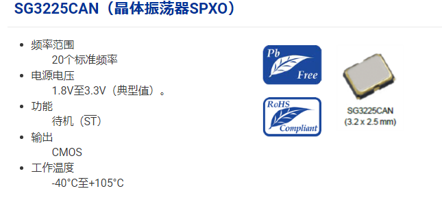SG3225CAN的輸出類型為CMOS輸出,電源電壓1.8V至3.3V(典型值),頻率范圍4—72MHz,工作溫度-40°C至+105°C。SG3225CAN的啟動時間5Ms,包含待機(jī)功能。