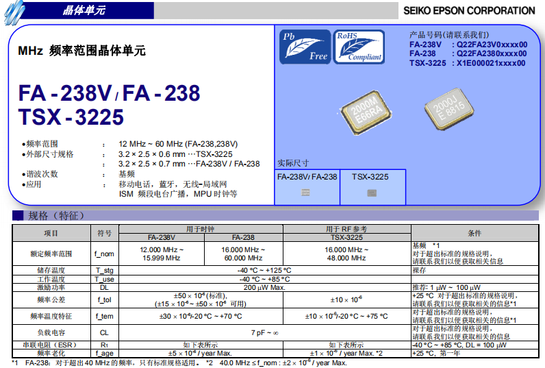 FA-238V晶振,體積3.2*2.5*0.7mm。頻率范圍12-15.999MHZ。長度兩腳間距為1.3mm,寬度兩腳間距為0.9mm。腳1方向有明顯斜角區(qū)分。腳位方向從貼片晶振正面左下方逆時針順序分別為1,2,3,4.