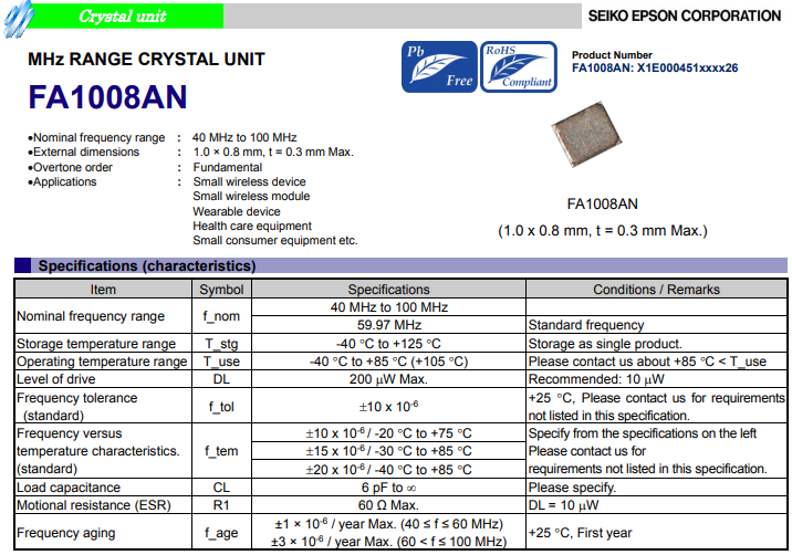 大家好,今天給大家來介紹下兩款微小尺寸和低高度的MHz頻率范圍晶體單元FA1210ANFA1008AN。去年愛普生推出了尺寸為1.2 x 1.0 x 0.3mm的FA1210AN。近期愛普生又推出了一款比FA1210AN更薄更小尺寸的FA1008AN。新推出無源晶體FA1008AN的尺寸相比EPSON其它MHz晶體單元更小,封裝尺寸:1.0 x 0.8毫米,頻率范圍:40 MHz至100 MHz(當前可用:59.97 MHz),頻率容限:±10 x 10 -6(+25℃),ESR:*大60Ω。下面給大家看下FA1008AN規(guī)格以供大家選項參考: