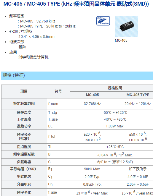 大家好,今天給大家介紹下可應(yīng)用于設(shè)計(jì)年限較長(zhǎng)的設(shè)備的32.768KHz無(wú)源基頻晶振MC-405。由EPSON推出的MC-405無(wú)源晶振為基頻晶振,不是泛音晶振,因而穩(wěn)定性更高,非常適用于通信設(shè)備、工業(yè)電子、汽車電子、消費(fèi)電子行業(yè),MC-405典型的應(yīng)用為時(shí)鐘和微型計(jì)算機(jī)。常用的負(fù)載電容MC-405 32.768KHz 12.5PF +/-20PPM PURE SN。MC-405無(wú)源晶振,可提供32.768kHz的固定頻率和20kHz~120kHz范圍的頻率,可適應(yīng)更多應(yīng)用場(chǎng)景需要。25℃、DL=0.1µW時(shí),兩種頻率下的標(biāo)準(zhǔn)頻率容差分別不超過±50X10-6和±100X10-6,具有較高的輸出穩(wěn)定性。兩種頻率下的頻率老化率分別僅為±3X10-6/年和±5X10-6/年,MC-405具有長(zhǎng)期的頻率穩(wěn)定性,較長(zhǎng)的使用壽命可應(yīng)用于設(shè)計(jì)年限較長(zhǎng)的設(shè)備中,下面南山電子就給大家分享下MC-405規(guī)格書以供大家選型參考: