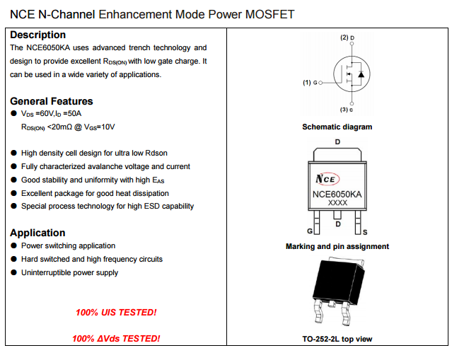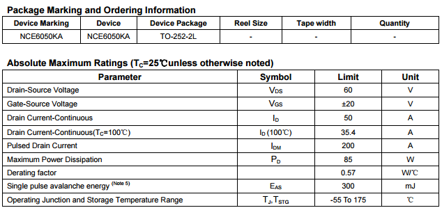 大家好 ,今天給大家介紹一款適用于60V電動(dòng)車控制器的可替代國外型號的MOS管NCE6050KA。場效應(yīng)管NCE6050KA是一款60V漏源電壓,50A電流,TO-252封裝的N溝道MOS管,說到60V和50A,我想甚至連不太接觸電子元器件的人也有點(diǎn)熟悉,好像在哪里見過,相信大家都買過電動(dòng)車,一般買的時(shí)候肯定聽過電動(dòng)車是60V或者48V的。NCE6050KA就是一款適用于60V電動(dòng)車控制器的場效應(yīng)管。目前在60V電動(dòng)車控制器的應(yīng)用中,MOS管主要損耗包括開關(guān)損耗(開通過程和關(guān)斷過程),導(dǎo)通損耗,截止損耗(漏電流引起的,這個(gè)忽略不計(jì)),還有雪崩能量損耗。只要把這些損耗控制在MOS管承受規(guī)格之內(nèi),MOS管即會正常工作。所以選取一款合適的MOS管是很有必要的,常用的60V電動(dòng)車控制器有捷捷微的JMTK50N06B,新潔能的NCE6050KA,都是不錯(cuò)的選擇,近期市場上NCE6050KA貌似很受青睞,我們南山電子就備有庫存,下面就給大家分享下60V電動(dòng)車控制器的常用型號NCE6050KA的規(guī)格書: