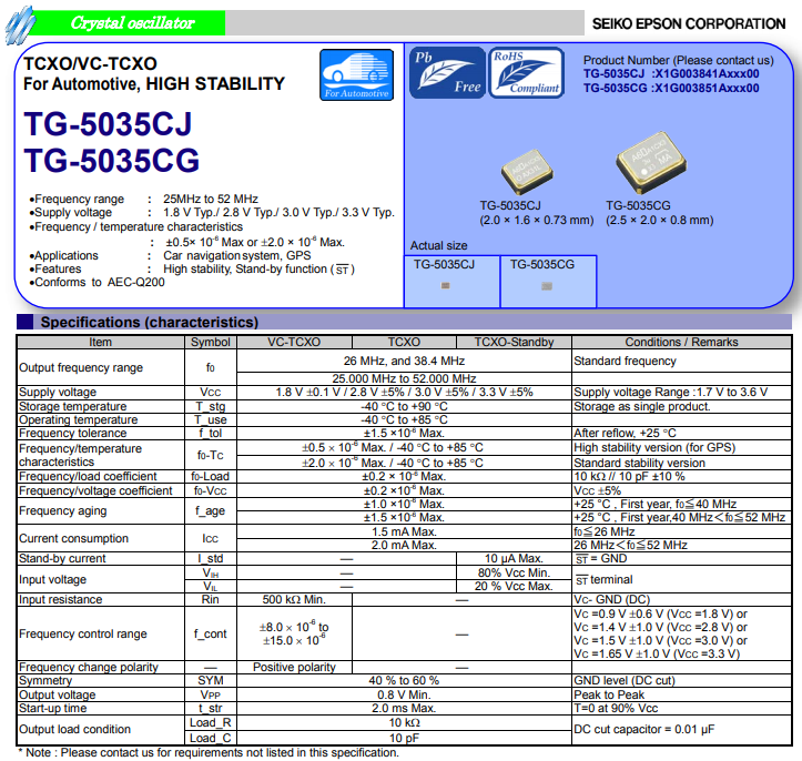 用于汽車無線通信系統(tǒng)中車規(guī)級溫補(bǔ)晶振:TG-5035CJ和TG-5035CG