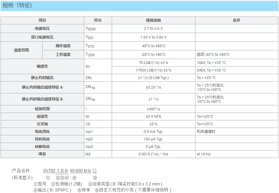 大家好,今天來給大家介紹下針對(duì)工業(yè)應(yīng)用的抗振動(dòng)和姿態(tài)控制的陀螺儀傳感器XV7021BB。XV7021BB陀螺儀傳感器的電源電壓(VDDM)均為2.7V~3.6V,接口電源電壓(VDDI)范圍為1.65V~3.6V,較低的電壓需求便于應(yīng)用電路的設(shè)計(jì);XV7021BB內(nèi)置溫度傳感器,并集成了用戶可選數(shù)字濾波器,用戶可選擇的低通濾波器和高通濾波器可實(shí)現(xiàn)各種截止頻率;同時(shí),XV7021BB具有低噪聲特性,噪聲為0.0015(º/s)/rtHz(@10Hz);具有很好的非線性誤差,僅為±0.5%FS,XV7021BB具有線性度較高,有較好的檢測(cè)精度;具有低功耗,非通信時(shí)的電流典型值均為0.9mA,待機(jī)電流典型值僅為160µA,睡眠電流典型值更是低至3µA,適用于以低功耗為重要考慮因素的應(yīng)用,如便攜式可穿戴領(lǐng)域等。