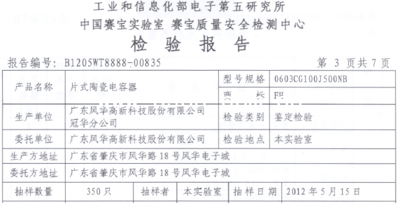 二、檢驗樣品來源:總數(shù)350只,由中國賽寶實驗室自行在風(fēng)華高新科技股份有限公司成品庫抽取后,帶回實驗室。本次抽檢型號為:0603CG100J500NB。