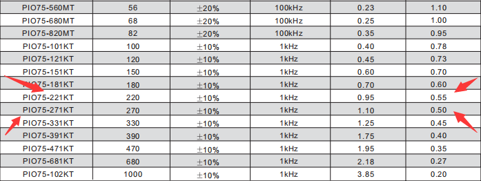 220uh功率電感 PIO75-221KT 電感220uh 公差±10% 測試頻率1kHz 直流電阻MAX 0.95Ω 飽和電流0.55A