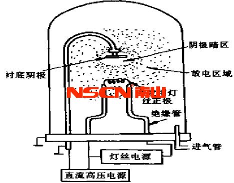 蒸發(fā)物質(zhì)的分子被電子撞擊后沉積在固體表面稱為離子鍍。蒸發(fā)源接陽極,工件接陰極,當(dāng)通以三至五千伏高壓直流電以后,蒸發(fā)源與工件之間產(chǎn)生輝光放電。由于真空罩內(nèi)充有惰性氬氣,在放電電場作用下部分氬氣被電離,從而在陰極工件周圍形成一等離子暗區(qū)。帶正電荷的氬離子受陰極負(fù)高壓的吸引,猛烈地轟擊工件表面,致使工件表層粒子和臟物被轟濺拋出,從而使工件待鍍表面得到了充分的離子轟擊清洗。隨后,接通蒸發(fā)源交流電源,蒸發(fā)料粒子熔化蒸發(fā),進(jìn)入輝光放電區(qū)并被電離。帶正電荷的蒸發(fā)料離子,在陰極吸引下,隨同氬離子一同沖向工件,當(dāng)拋鍍于工件表面上的蒸發(fā)料離子超過濺失離子的數(shù)量時,則逐漸堆積形成一層牢固粘附于工件表面的鍍層。如圖4