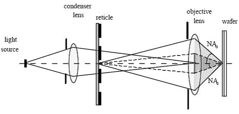 光刻的原理起源于印刷技術(shù)中的照相制版,是在一個(gè)平面上加工形成微圖形。隨著器件尺寸的不斷縮小,光刻技術(shù)也從最初的接觸式、接近式曝光發(fā)展到目前普遍使用的投影式曝光,圖1是投影式曝光示意圖。投影式曝光技術(shù)中由于硅片和掩膜版沒有接觸,從而避免了由于接觸引入的工藝缺陷,同時(shí)掩膜版的利用率得以提高,因此,該曝光技術(shù)成為了目前光刻技術(shù)的主流。
